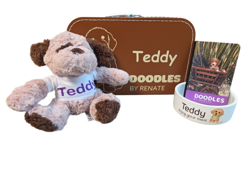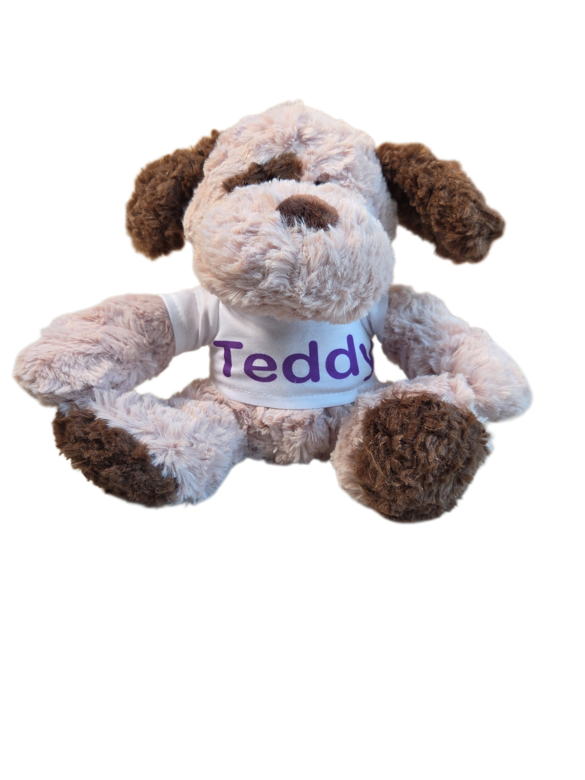 Leuke knuffels met naam of andere tekst van de pup op het shirt. Ze kosten 19,95