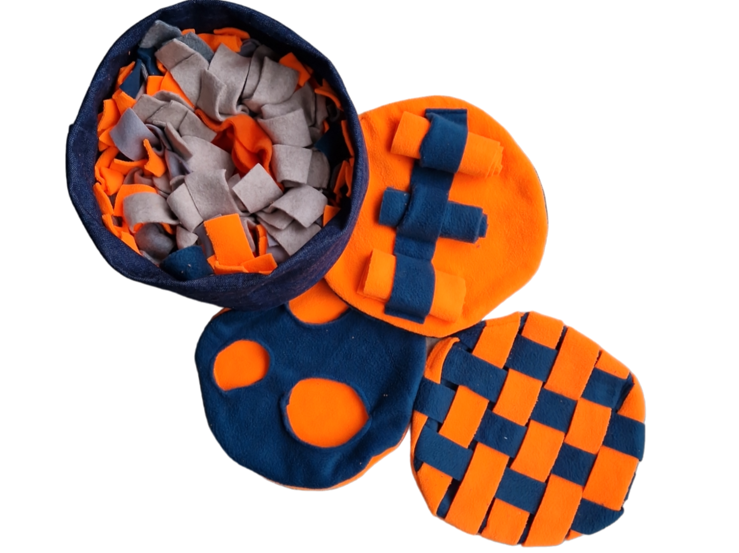 De snuffeltortilla is een mand met maar liefst 4 losse puzzels. Je kunt de puzzels los aanbieden, of  1 voor 1 in de mand, of gestapeld om het nog moeilijker te maken. De snuffeltortilla met 4 losse puzzels kost 34,50. De variant met op de bodem een snuffelmat kost 36,50. In bijna alle gewenste kleurencombinaties leverbaar geheel naar eigen wens samen te stellen.