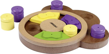 Leuk leerspeelgoed voor jouw leergierige hond. Onder de houten kegels en de draaischijven kunnen brokjes of snoepjes verstopt worden. Deze snoepjes kan jouw hond dan al spelenderwijs opspeuren.