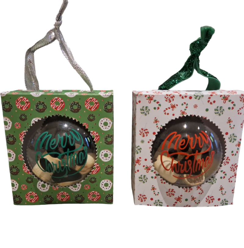 Gepersonaliseerde kerstballen gevuld met lekkere snacks en voorzien van feestelijke verpakking. Een kerstbal kost 8,95. Uiteraard ook verkrijgbaar voor al uw andere huisdieren